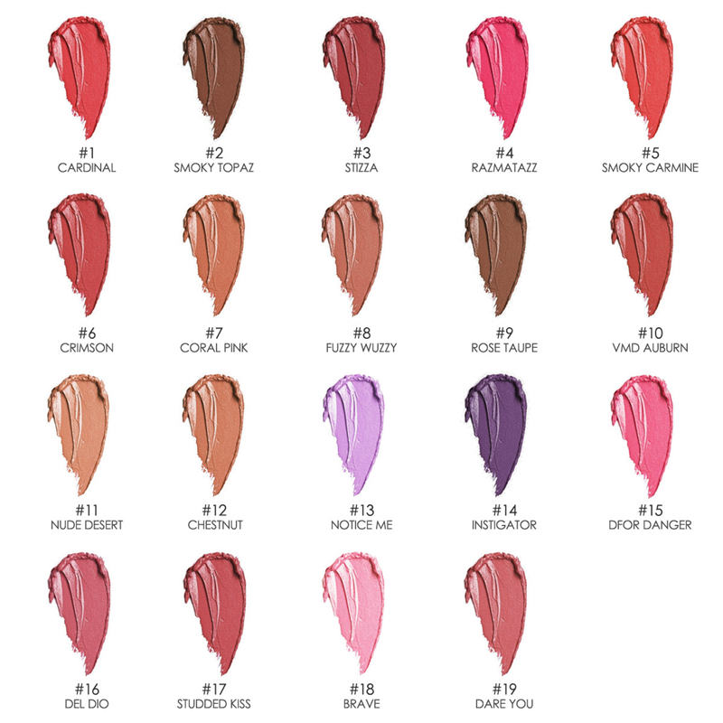 01Cardinal, 2 Smoky Topaz, 3 Stizza, 4 RazzMatazz, 5 Smoky Carmine, 6 Crimson, 7 Coral Pink, 8 Fuzzy Wuzzy, 9 Rose Taupe, 10 Auburn, 12 ChestNut, 16 Del Rio, 17 Studded Kiss, 19 Dare You, 24 Copper